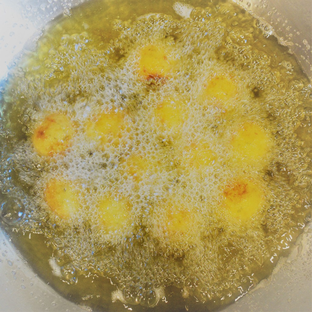 When ready to serve, heat the olive oil to 350°F and fry the potato balls until golden, about 3 minutes. It’s a very quick process!