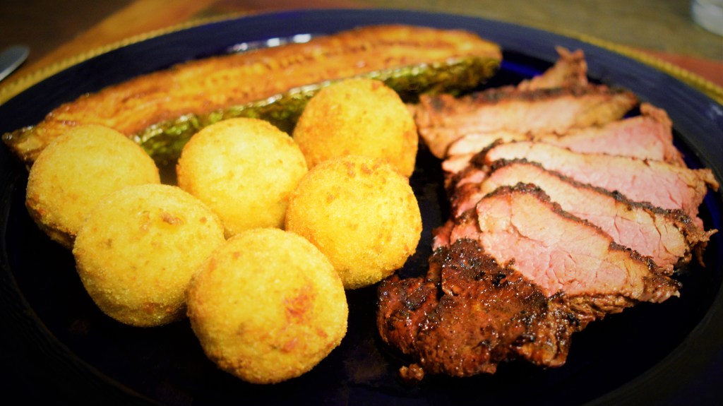 A first! For the first time, last night I made Bolinhos de Batata (Brazilian Potato Balls) to accompany Brazilian-style, wood-grilled sirloin tri-tip. They were delicious, even better than what Brazilian steakhouses serve! Also, Merchant Spice Co.‘s Brazilian Seasoning makes a great rub on the steaks prior to grilling. Simply season the steaks with coarse sea salt (we sell a Brazilian coarse sea salt), olive oil and a generous amount of the Brazilian Blend ~ rub it all in; marinate for 4 hours or overnight. Now for the potato balls, here’s the recipe …